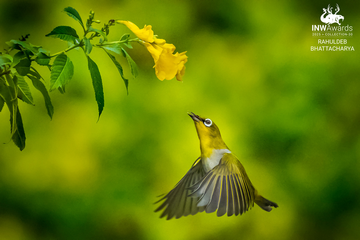 Reaching new heights On a cool morning in December 2024,an Indian White-Eye hovers beautifully while feeding on nectar in West Bengal,India.