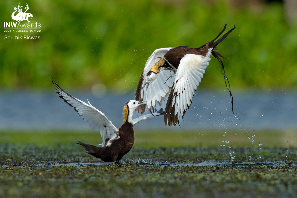 Two Pheasant-tailed Jacanas engage in a fierce territorial fight during the breeding season. Though typically peaceful, these elegant birds become highly aggressive while defending nesting areas. Captured in the wetlands of Bardhaman district, West Bengal, this moment showcases the dramatic side of their breeding behavior.