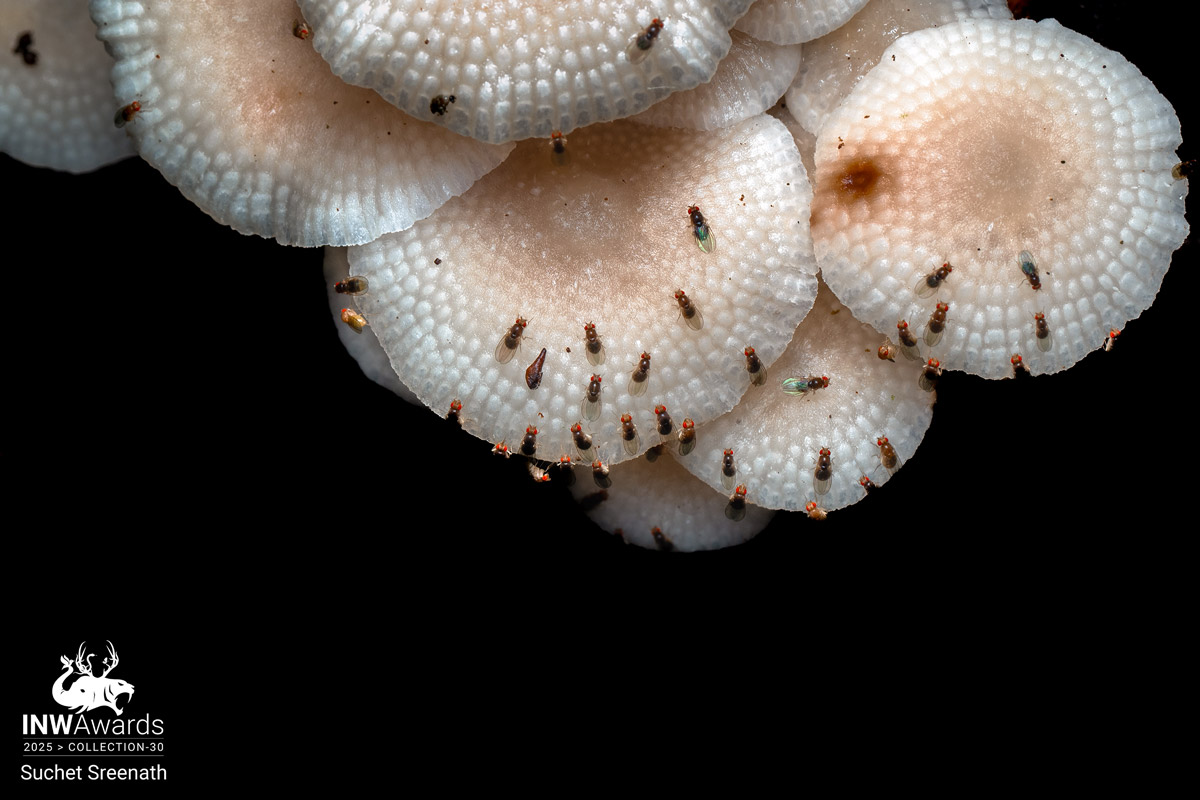 An intricate colony of fungi, that becomes a stage for a microscopic gathering of a dozen of flies dot its surface. Its elegant wings shimmer subtly against the textured white caps, forming an unspoken bond between the decay and life. This photo portrays the contrast between stillness and movement, symmetry and chaos, where decomposition births a thousand small interactions. Place: Periyar Tiger Reserve, Kerala When: 10th June 2025