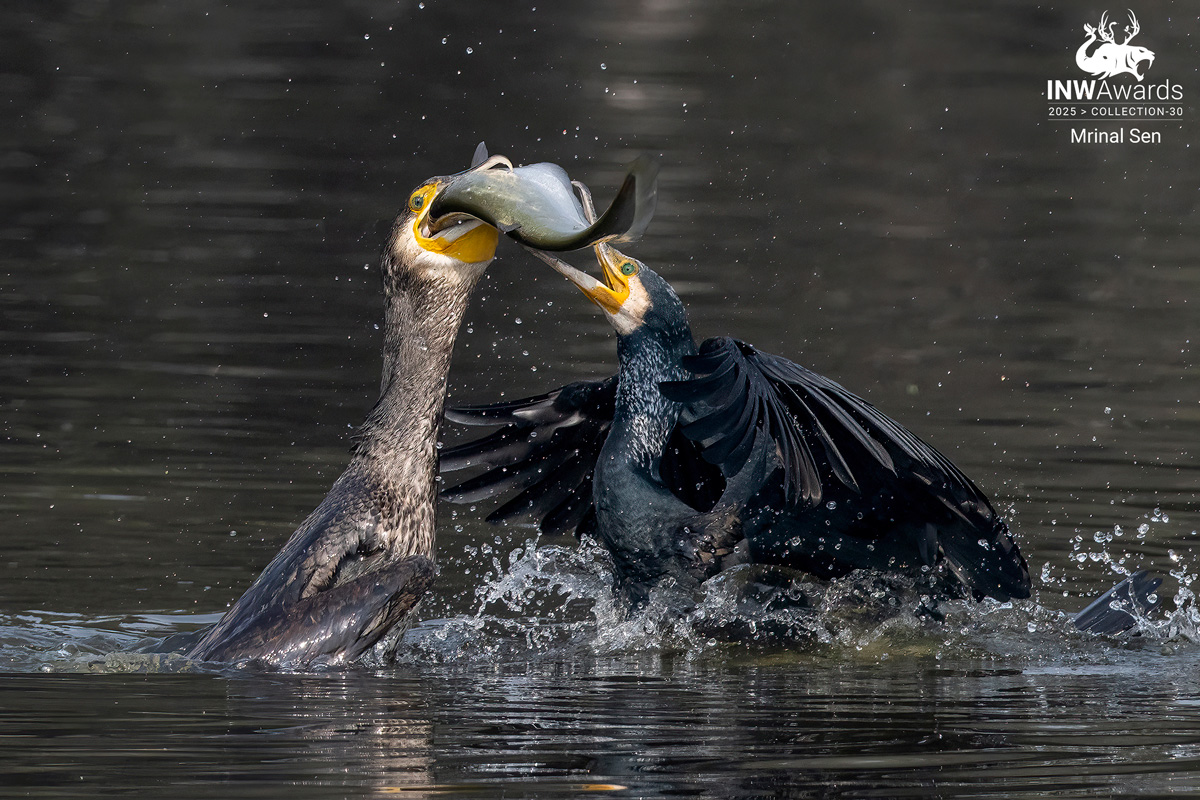 Combat for fish - Two great cormorants clashed in a fierce battle over a fish, their movements a testament to raw momentum. With each powerful flap of their wings, water splashed in rhythmic bursts, creating a dynamic scene of energy and motion. The fish, caught in the fray, darted frantically, adding to the chaotic ballet. Each cormorant’s lunge and retreat was driven by sheer force, their sleek bodies cutting through the water with precision. The momentum of their struggle was palpable, a relentless push and pull until one finally seized the prize, leaving the other to glide away, momentum spent but spirit unbroken.