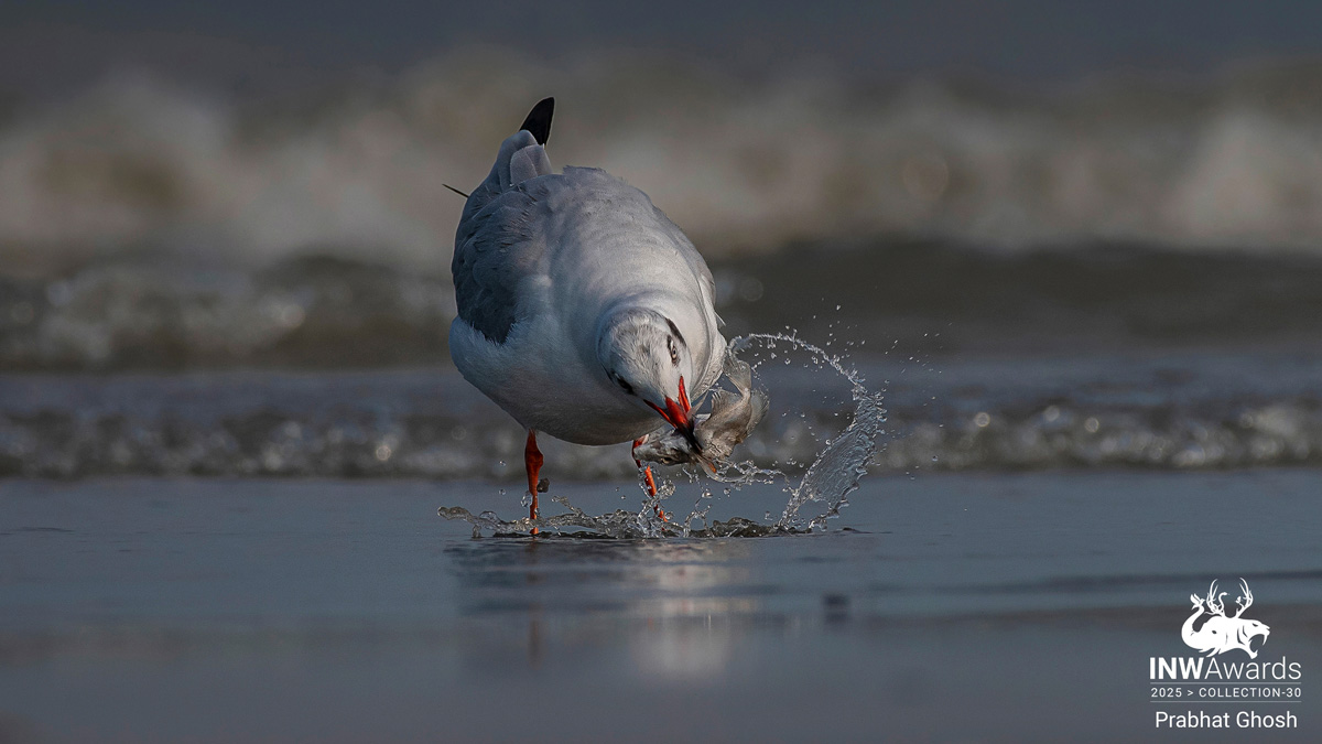 In the split-second before victory, a Brown-headed Gull delivers its final blow to secure breakfast along the surf-lined shores of the Indian coast.