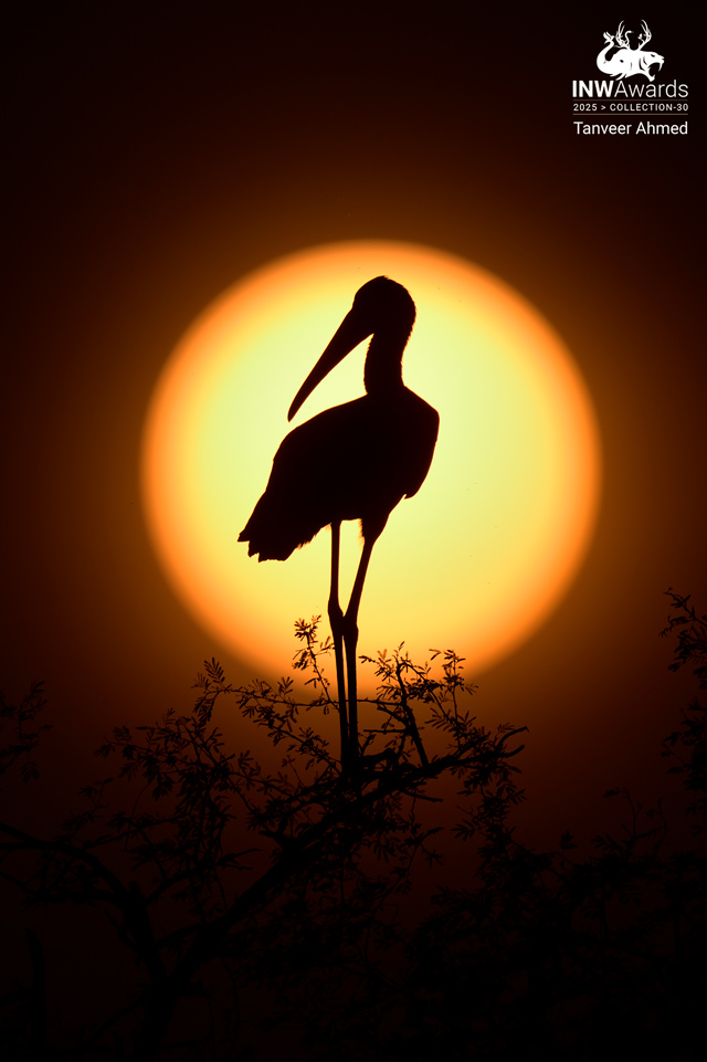 As the golden sun pierced through the winter fog at Keoladeo National Park, a majestic stork stood tall, perfectly silhouetted against the glowing orb. The ethereal morning light bathed the scene in a soft, amber warmth, transforming a simple perch into a dramatic stage of stillness and grace. This moment, frozen in time, captures not just the bird—but the very soul of Bharatpur’s wetlands in winter. The silence of the dawn, the crisp bite of fog in the air, and the bird's tranquil poise evoke a sense of quiet awe.