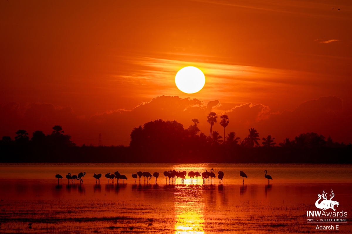 Title: Dawn Ballet Description: A breathtaking silhouette of a flock of Greater Flamingos wading gracefully in the golden glow of sunrise. Captured at Koonthankulam Bird Sanctuary in Tamil Nadu, India, after months of patient observation and early morning waits, this frame brings together the ethereal beauty of these elegant birds with the warm hues of a southern Indian dawn. The image symbolizes serenity, perseverance, and the delicate rhythm of nature as it awakens with the first light.