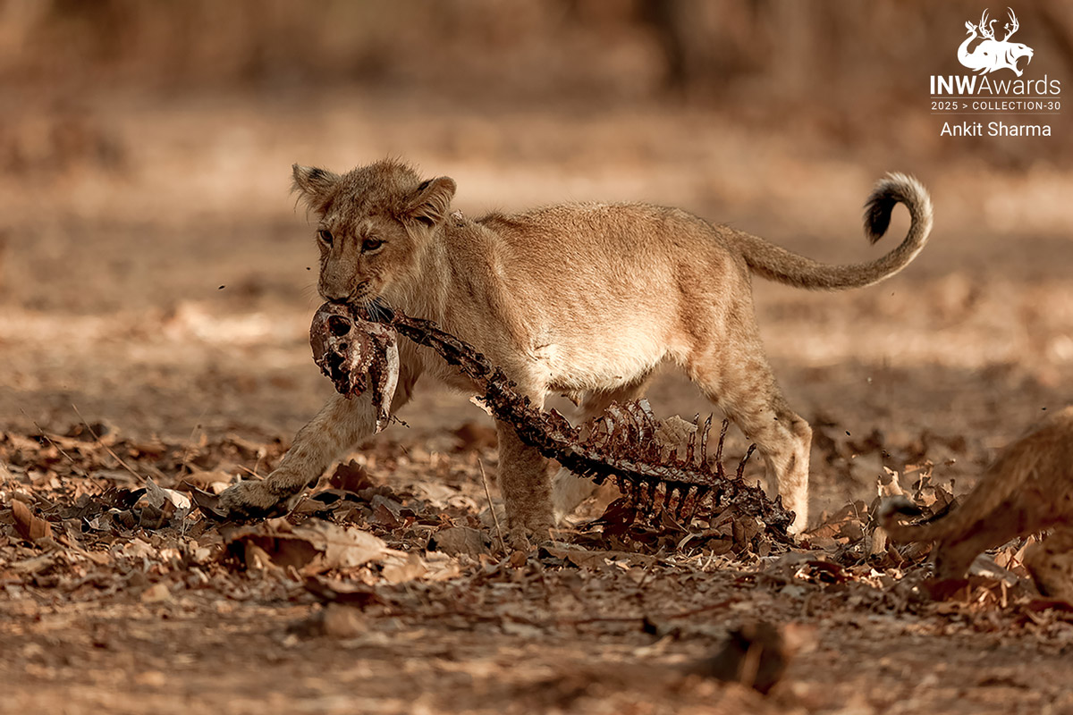 Learning lessons of life - Dead but still Alive. "In the silence of the forest even bones have lessons to teach" Born into the wild - Young Lion cub walks into the untamed path of its ancestors.With the spin in its jaws and curiosity in its stride, it carries not just a carcass but the beginnings of survival, strength & instinct passed down through generations.