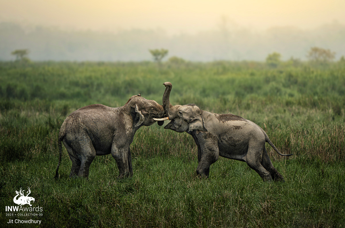 n the heart of the grasslands, two wild Asian elephants engage in a powerful yet graceful interaction, captured during golden hour. This image, taken in the misty wilderness of Northeast India, freezes a moment of raw emotion and energy as the elephants lock tusks in what could be a playful duel or a show of dominance. Their mud-caked skin glistens under the soft morning light, reflecting their rugged journey through the wild. The backdrop of lush green and a hazy sky sets a dramatic tone, emphasizing the raw beauty and majesty of these endangered giants. Shot using a Sony A7 IV paired with a Sony 200-600mm lens, the image highlights intricate textures and expressions with clarity and depth. This frame is not just a display of wildlife behavior, but a powerful reminder of the complex lives animals lead in their natural habitat.