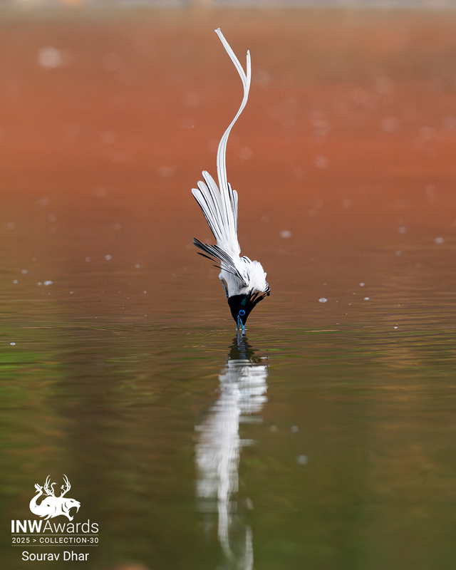 There’s a serene joy in watching the Indian Paradise Flycatcher glide through the air and dip into the water for a bath on a hot summer day. Its graceful, majestic, flowing tail trails behind like a ribbon dancing on the breeze.