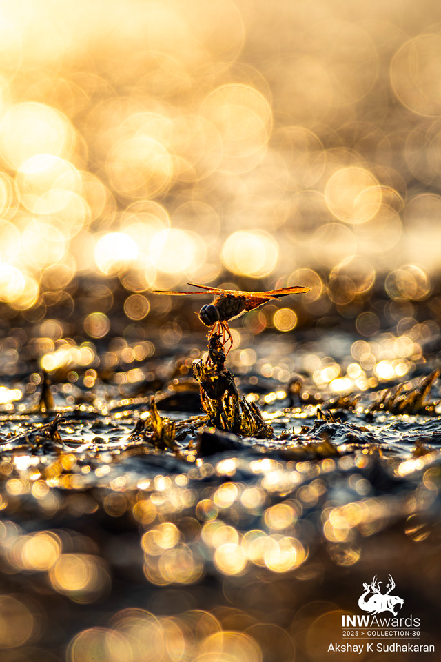 A lone dragonfly perches gracefully on a tiny stick jutting out from a calm waterbody in Palakkad, Kerala. Captured during the golden hour, the warm evening light reflected off the ripples, forming countless glowing bokeh circles. With the subject positioned perfectly at the center, the frame radiates peace, balance, and the quiet magic of nature’s golden moments.