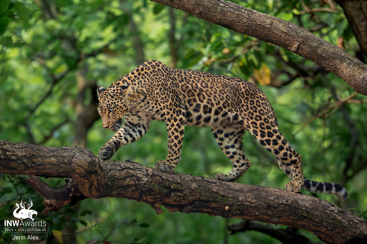 A magnificent Indian leopard (Panthera pardus fusca) gracefully moves along a sturdy tree branch, perfectly blending into its lush forest surroundings. The leopard's muscular frame and rosette-patterned coat are vividly highlighted by the dappled sunlight filtering through the canopy. Location: Rajaji National Park, Uttarakhand