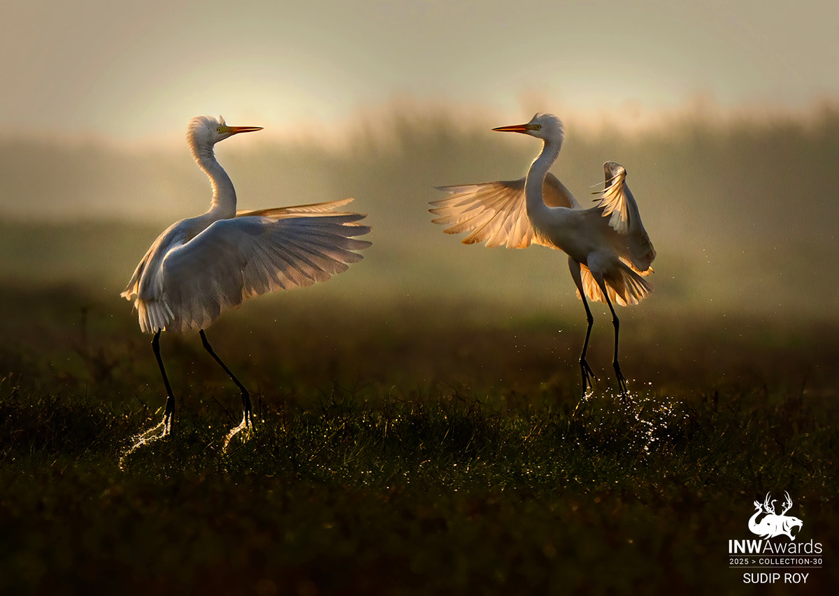 This image of egrets was taken in Monglajodi, India. Two egrets are engaged in a fight during the morning golden hour, with the shot taken against the light to create a creative and striking effect.