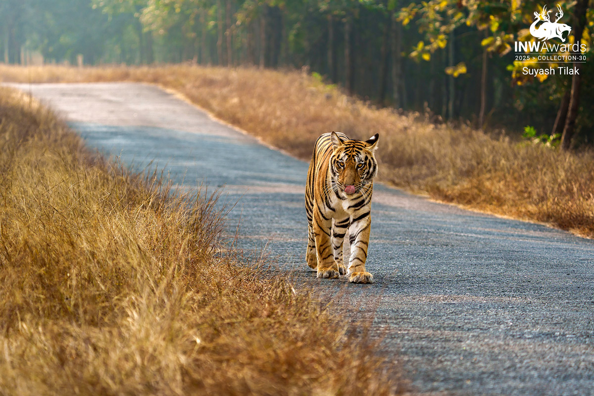 Walk of Pride the subadult cub in Pench walks his territory making sure others know of his presence. The tiger was walking on the tar road maintaining an eye contact with the jeep and constantly making sure there was no challenger around him.