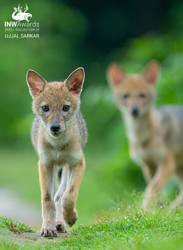 Newborn Golden Jackal Pups Place of picture - Nrisinghapur , WB DOC - 25/05/2025 A local farmer informed me that a fox had given birth in the forest beside his farmland. Excited, I grabbed my camera and rushed to the location, hoping to capture a rare moment. It had been raining all day, but I waited patiently in the downpour, anticipating their appearance. Hours passed, and after nearly four hours of waiting in the wet and cold, the moment finally arrived — the fox emerged from the den with her curious little pups. I quickly took this shot: the mother stands protectively in the background, while the pups, with wide, surprised eyes, stare straight at me. It was a magical, unforgettable moment in nature.