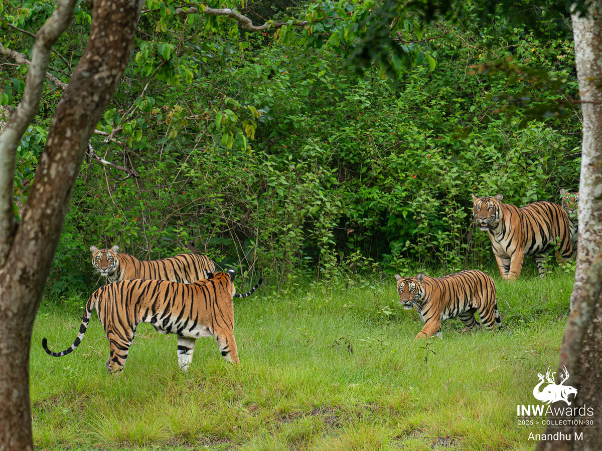 Tiger Family – Mother and 4 Cubs | Kabini Forest, Karnataka, India This was my first solo trip to Kabini. Being the monsoon season, tiger sightings were expected to be rare, but I took a chance. The thought of witnessing a tiger in the lush green backdrop of the rains was too tempting for my camera to miss. I planned a week-long stay, heading out for safaris each morning and working afterward. The first few safaris were quiet, no signs of big cats. Then came my 5th safari. Just minutes into the forest, we saw two sloth bears. Soon after, we spotted a majestic male tiger. That alone made the day, but it wasn’t over yet. Suddenly, our driver received a call: a female tiger was resting in the open. We rushed to the location, and I began photographing her. And then… magic happened. From the nearby bushes, her sub-adult cubs emerged, one by one. Four of them. Moments later, we saw the male tiger again, a bit farther away. In front of me was an entire tiger family six in total. I couldn't capture all six in one frame since the male was at a distance, but I did manage to get the mother and her four cubs together. It was surreal. A once-in-a-lifetime moment etched forever in memory and in pixels.