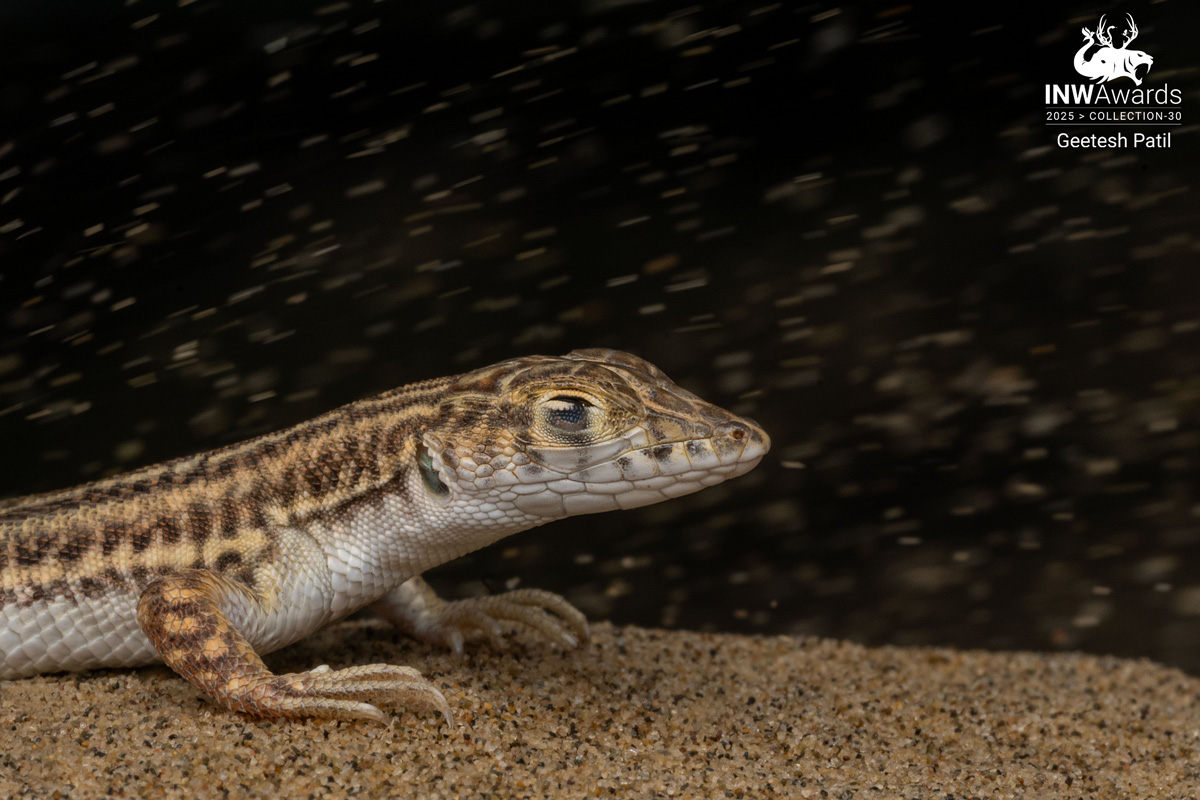 Master of the Sands: The Indian Fringe-Toed Lizard's has some Ingenious Survival Strategies. In the arid sands of Thar desert, the Indian fringe-toed lizard (Acanthodactylus cantoris) has overlapping eyelid scales that shields its eyes from the relentless desert winds. The lizard also has a shovel-shaped snout for digging and a fringed scales on its toes to help it move across the sand. Together, these adaptations allow this remarkable reptile to navigate and thrive in one of Earth's harshest environments.