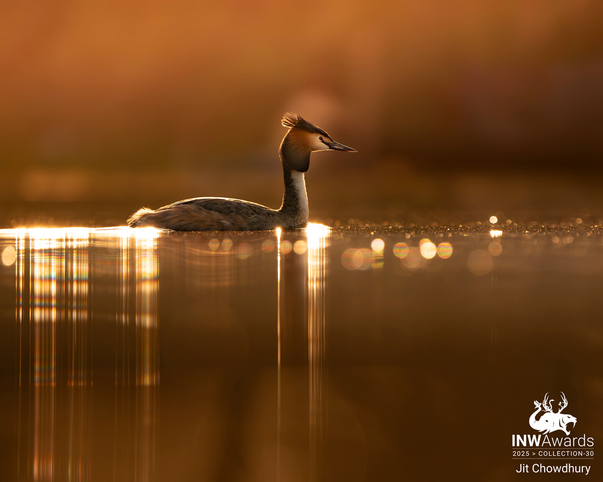 In the golden light , a Great Crested Grebe glides gracefully across the still water, surrounded by shimmering reflections. Captured in perfect backlight, the bird is silhouetted by the soft, warm hues of sunrise, creating a magical atmosphere. The light plays off the water’s surface, forming vertical golden lines and bokeh that add a dreamy, ethereal quality to the scene.using a low angle to emphasize the intimate perspective. My aim was to capture not just a portrait, but a moment—where light, subject, and environment come together in harmony.