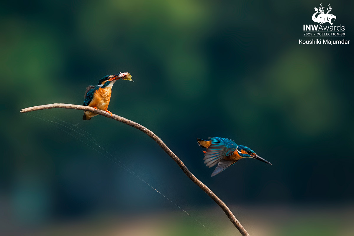 The image captures a dynamic interaction between a pair of common kingfishers. On a gently curving branch, the female common kingfisher is perched, a small fish held firmly in her beak – a reward from a previous successful hunt by her mate. Meanwhile, a flash of brilliant turquoise and orange marks the arrival of the male common kingfisher. He is in full flight, wings spread wide as he approaches, seemingly still on the hunt or perhaps returning to his mate after another fishing expedition. His focused posture suggests he is either actively searching for more food to bring or is returning with the intention of impressing his partner, showcasing his prowess as a provider. The blurred background of greens and blues emphasizes the vibrant colors of the birds and the significance of this moment of sustenance and potential courtship. Location- Purbasthali, Purba Bardhaman, West Bengal