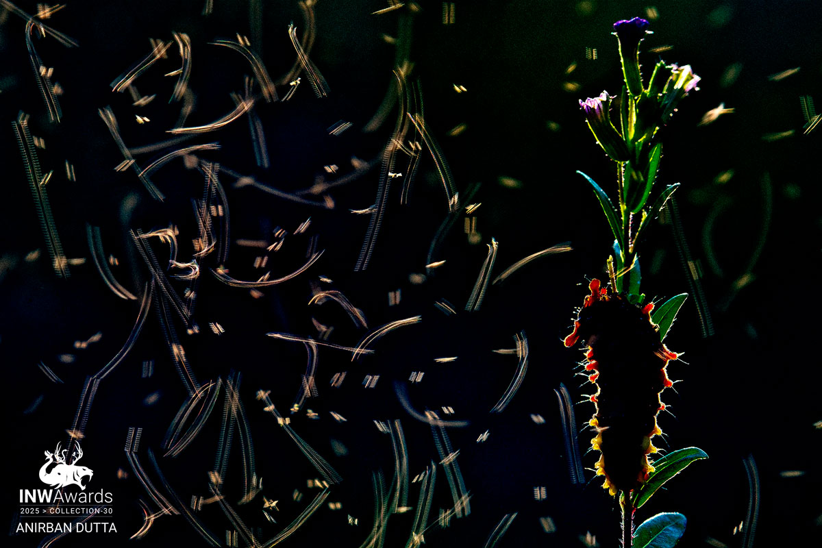 CATERPILLAR IN CHAOTIC LIGHT: This is a very busy frame of chaotic lights with a caterpillar. This is very rare Red slug moth caterpillar resting on weeds. But the mystery is back light movement. I always try to create eye catchy, colourful and attractive images to impress people towards Mother Nature. The moving motion in the background is due to the speedy movement of tiny paddy flies. I frequently used to go in village to get fresh air after my school. In urban life there is lack of greens and full of air pollution. One day I was seating near a paddy field and observed some tiny flies movement over the ripen paddy plant. This shot was taken near a ripen golden paddy field. After 3 pm when the sun started setting down slowly, I observed these very small sized flies flying chaotically just over the ripen paddy plants. These flies can be found when paddies become ripen. But these flies can only be seen when you are facing Sun (in front of you) and light falls on the flies. I planned a dramatic and eye-catchy image. I have used in-camera multiple exposure technique to achieve this eye-catchy image. I have taken the first shot of small caterpillar in anti-light with Tamron 90 mm VC USD and then changed the lens 200-500mm to get the images of flying flies some in high and some in slow shutter speed.