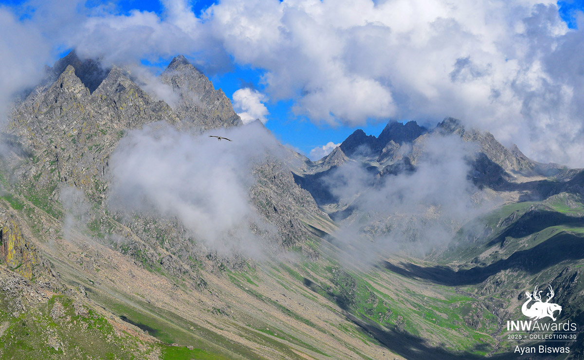 Nothing before the Himalayas. A Himalayan Griffon Vulture gliding effortlessly over the vast Himalayan basin. Soaring from the rocky heights it calls home, over green meadows and toward a distant water stream below. I tried a minimalistic approach to capture not just the bird, but the vertical span of its world, from perch to prey, from silence to sustenance. (Humble request to the viewers, kindly view this image on a larger screen.) Ganderbal, Kashmir.