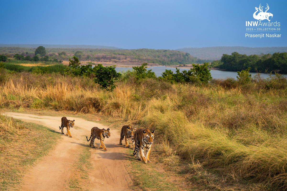 Amidst the golden grasslands and beside a serene river, a tigress leads her cubs with quiet confidence through the heart of the Indian wilderness. Captured during a fleeting moment of natural harmony, this image tells a story of strength, protection, and the untamed beauty of the wild. The warm sunlight, vibrant landscape, and the majestic presence of the tigers together create a powerful composition that celebrates both the fragility and grandeur of wildlife. Place Panna National Park, Exposure bias: -0.7 step, Shutter speed 1/8000 sec, ISO - 500, Focal Length -70 MM, F 2.8, Metering – Pattern.
