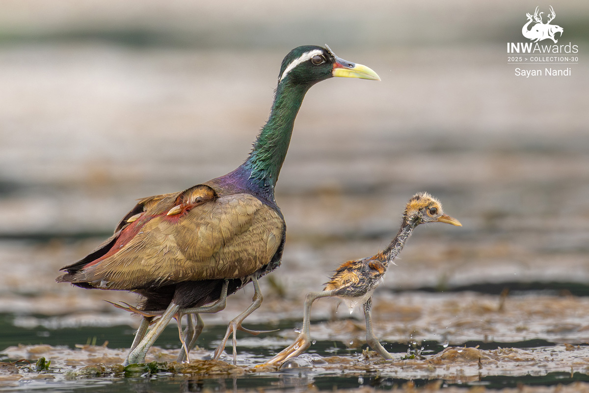 A bronzed-winged jacana father gracefully strides across wetland, showcasing his remarkable parenting. Two tiny chicks are nestled snugly among his back feathers, their heads just visible as they peek out from behind his wings. Meanwhile, a third chick toddles beside him, its oversized feet tiptoeing across the water plants, closely following its devoted father. A beautiful glimpse into the jacana’s rare role reversal, where the male takes full charge of parenting. This picture was captured in Purbasthali, West Bengal on August, 2024.