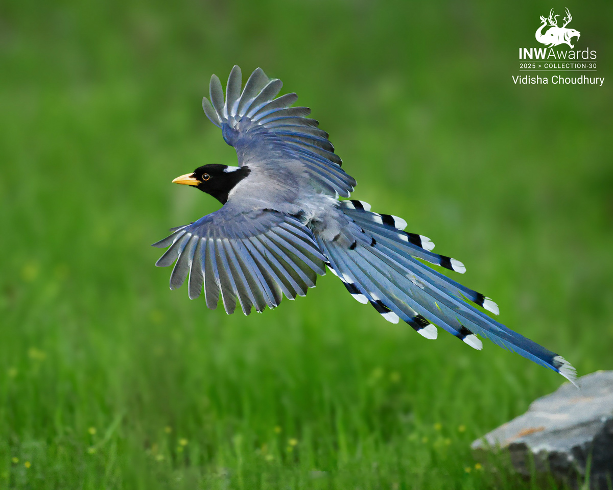 Flight of Glory is how I would describe this image. Taken this year during Spring in the valley of Bhaderwah in Kashmir , this beautiful Himalayan beauty Yellow Billed Blue Magpie was gliding around in the wee hours of the morning in a lush green private field with little yellow flowers here and there....I was at eye level and wanted to get that perfect angle where I can capture its beautiful blue and black feathers and tail. But after a couple of attempts I realised I need to position my self a little higher than this beauty to be able to get the full wingspan. So I hiked up to the edge of the road coming as close as possible and overlooking the field where finally I got the perfect angle of its flight when it took off from the branch and glided all around very close to the grasses giving me the shot i was waiting for.