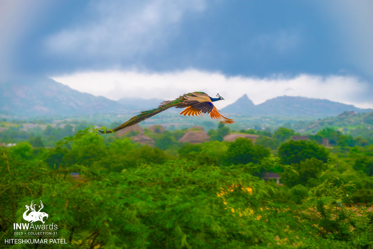 Monsoon Flight The image features a male Indian peacock (Pavo cristatus) in mid-flight. Its iridescent plumage and long train are vividly displayed, a sight less commonly photographed as peacocks usually prefer the ground for movement. The lush greenery below, undulating rocky hills in the distance, and monsoon-laden sky capture Jawai’s rich parched terrain being revived by seasonal rains, conveying both the wild beauty and serenity of the region. This fleeting moment—a peacock in flight—is a symbol of the raw natural splendor and timeless peace found in Jawai