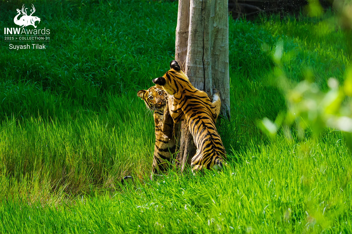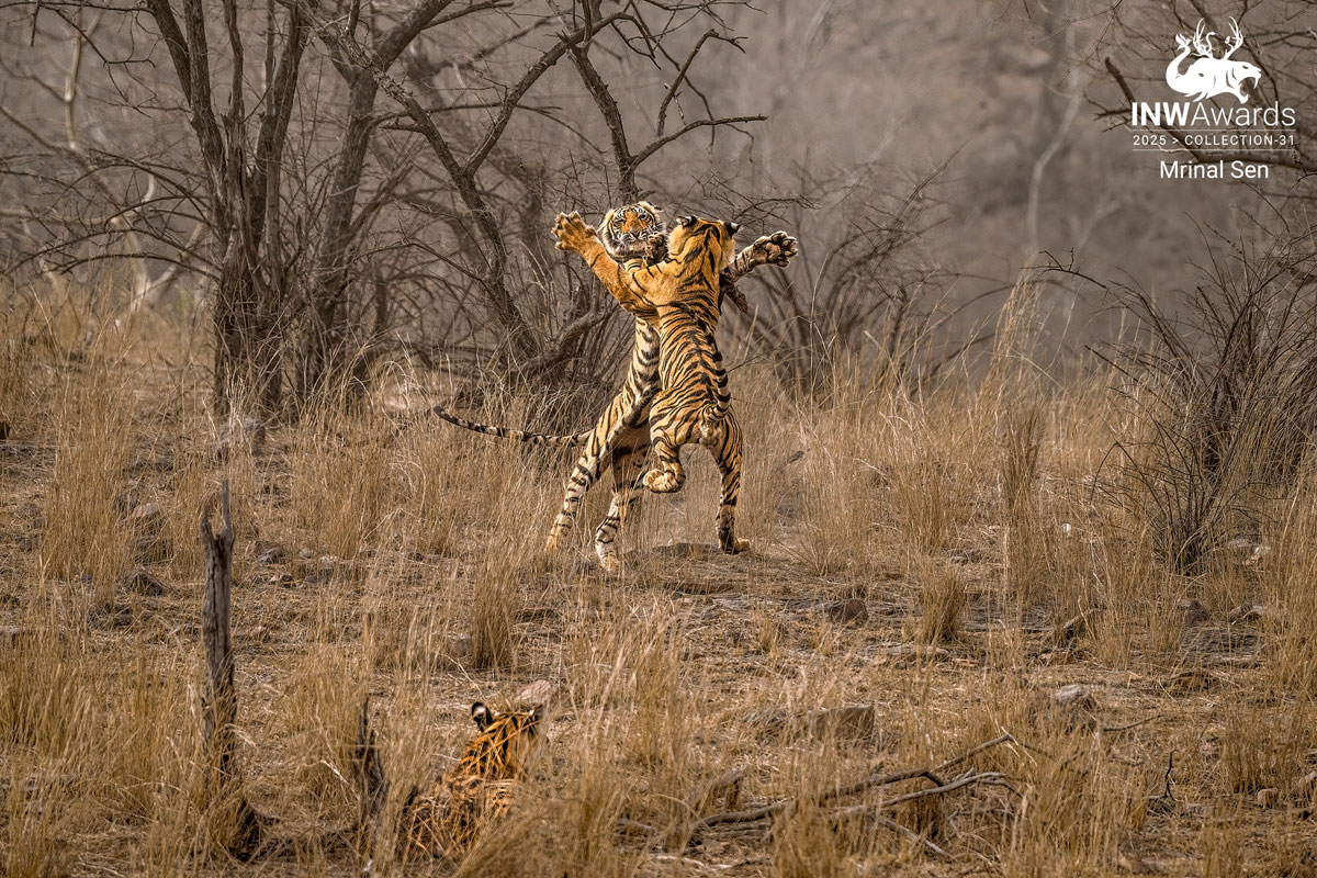 Royal Game - In the golden dry grasslands of Ranthambore, I witnessed a rare and electrifying moment—two sub-adult tiger cubs locked in a fierce mid-air tussle. What began as a playful morning turned into a dramatic skirmish after one cub managed to catch a mongoose that crossed their path. Another sibling quickly lunged in to challenge the prize, leading to this spectacular leap—a perfect mix of raw instinct and youthful energy. In the foreground, a third cub watches with calculated caution, unsure whether to join or stay clear. The inspiration behind this photograph was to portray the wild not just as a place of beauty, but of constant interaction, learning, and survival. The cubs’ fight isn’t just play—it’s practice for the life that lies ahead in the competitive jungle.