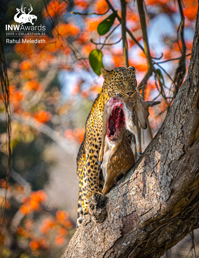 "Meeshakari’s Triumph: A master of the hunt, this majestic female leopard drags her spotted deer prize high into the trees, securing her feast in the canopy of Bandipur’s wild heart." In this powerful moment, Meeshakari, a remarkable female leopard from Bandipur Tiger Reserve, showcases her strength and stealth. With her spotted deer in tow, she ascends the tree, ensuring her hard-earned meal is safe from scavengers. The vibrant forest backdrop contrasts with her elegant yet fierce determination. Leopards are known for their ability to haul prey into trees, and Meeshakari exemplifies this skill—her agility and hunting prowess shining through. This image captures not just the hunt, but her mastery over her environment, symbolizing the raw beauty and power of the wild.