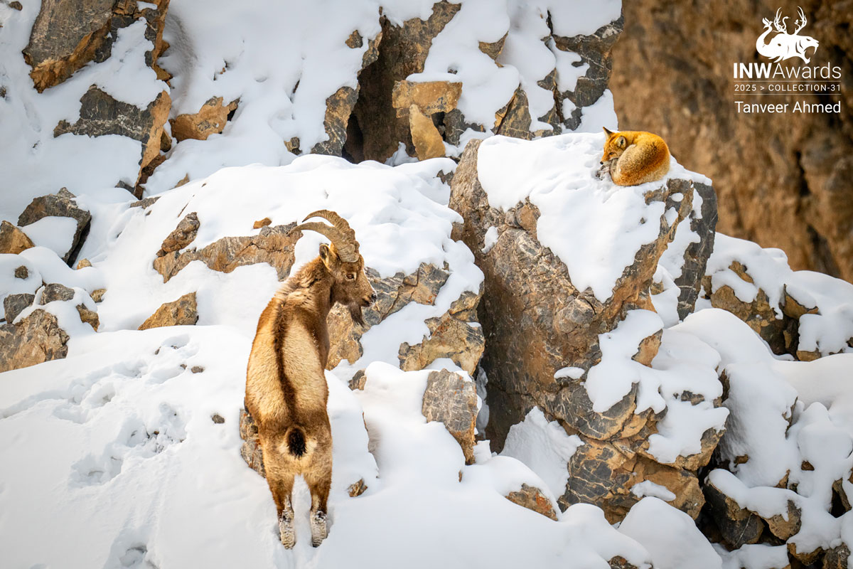 High in the frozen cliffs of Spiti Valley, survival plays out in quiet, patient moments. On a frigid morning, an ibex carefully navigates the snowy ledges, its curved horns and sturdy hooves built for these unforgiving mountains. Just a few rocks away, curled against the cold, a red fox lies still — conserving energy, waiting, watching. There is no chase, no immediate drama, only a fragile coexistence between predator and prey. In this suspended moment, the snow-clad silence feels heavier than action. The ibex, alert but unhurried, keeps its gaze fixed, while the fox, cloaked in fiery fur against the white, seems to measure its chances. For me, this encounter captured the essence of wild Spiti: a landscape where survival is not always loud or violent, but often written in quiet standoffs, in patience, in the balance between hunger and endurance. Place - Spiti Valley; Feb 2025