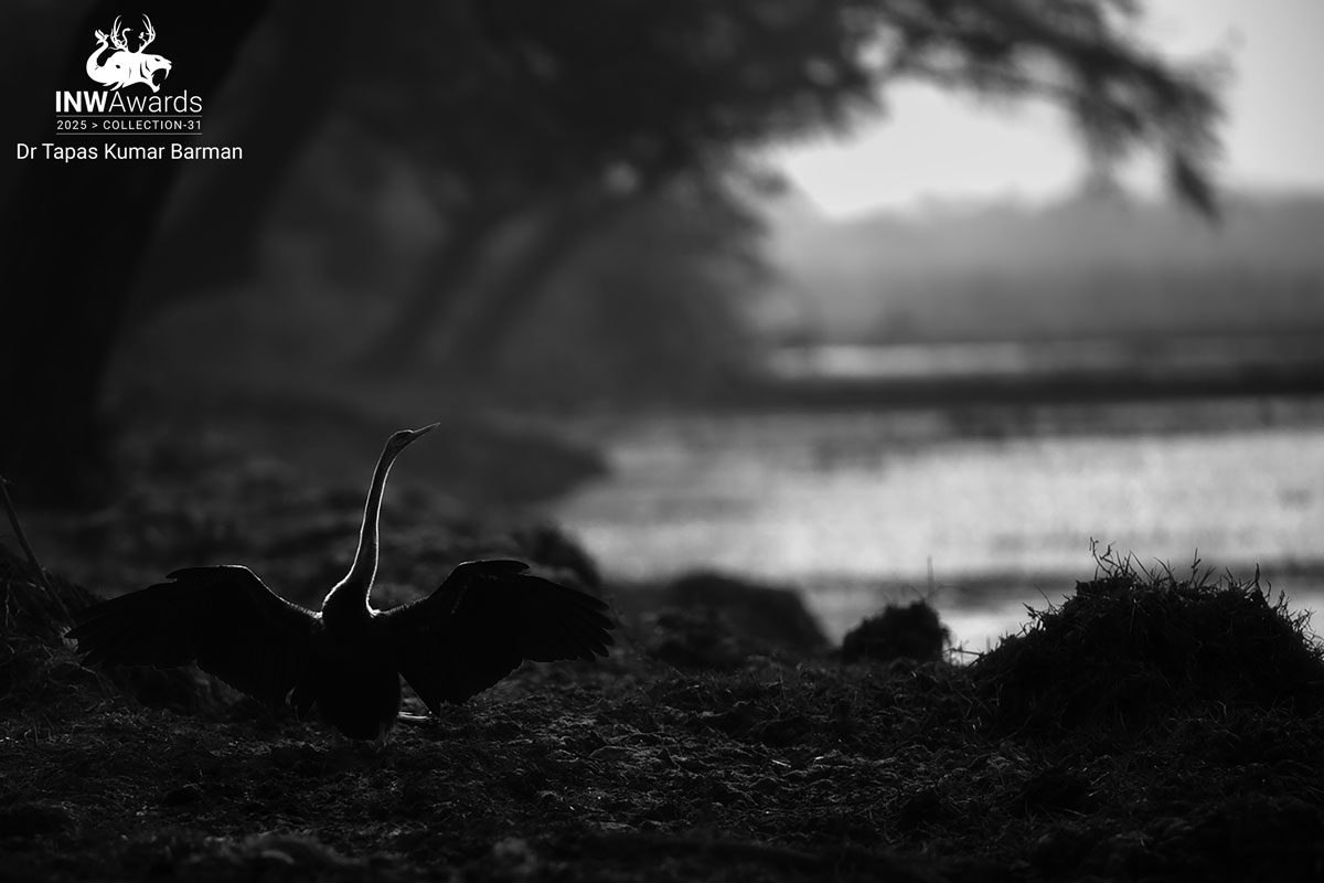 The Silent Wings. This darter photo is taken in backlight, with the sun shining from behind the bird. The light highlights its long neck and open wings in silhouette, creating a dramatic contrast against the brighter water background. Place: Keoladeo National Park,Bharatpur, Rajastham, India