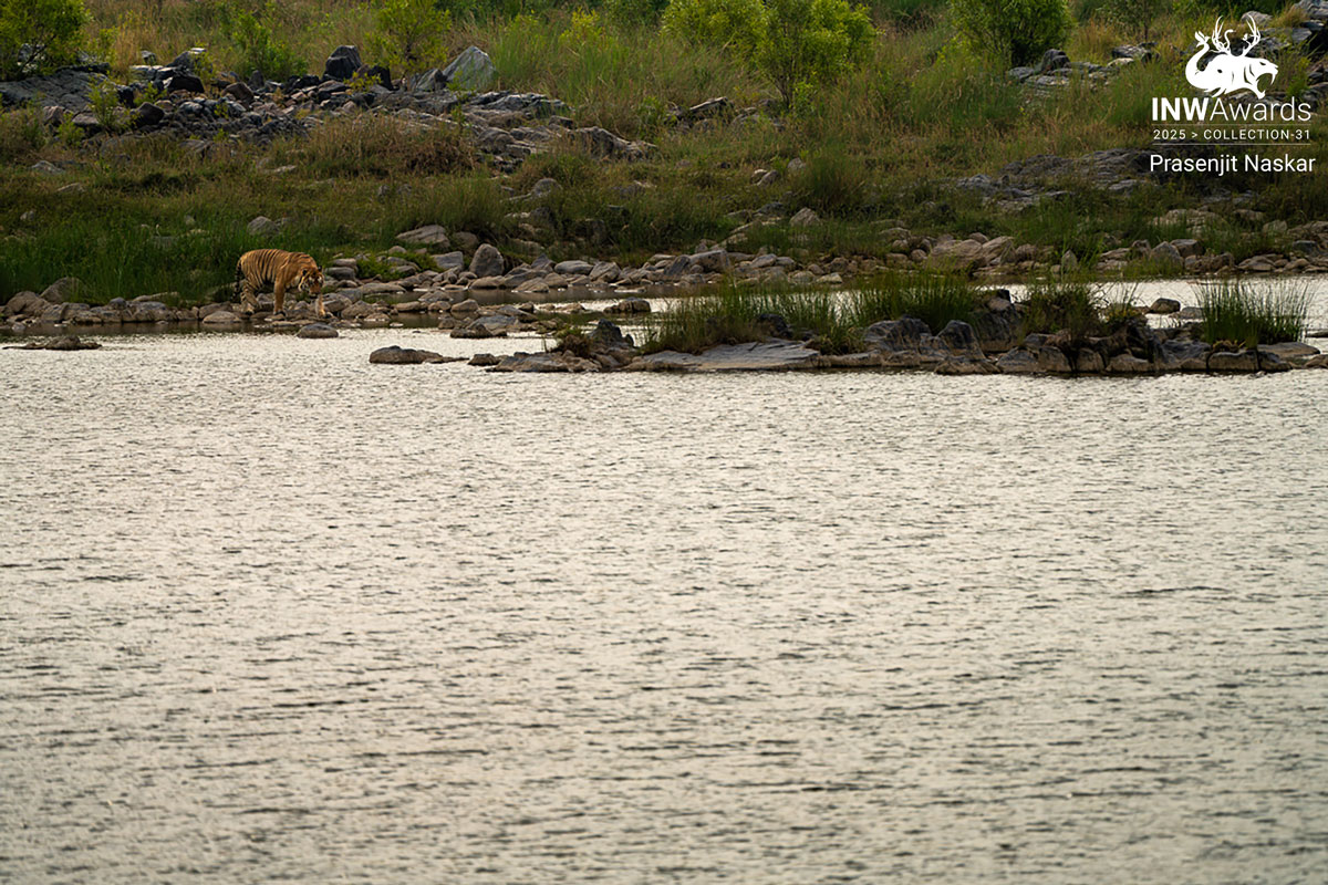 In the stillness of the wild, a tiger emerges at the water’s edge, its powerful frame softened by the rippling ken river of panna tiger reserve before it. Each step is measured, every movement steeped in quiet dominance. Against the rugged backdrop of rock and grass, this solitary figure becomes both predator and poet — the beating heart of the wilderness.