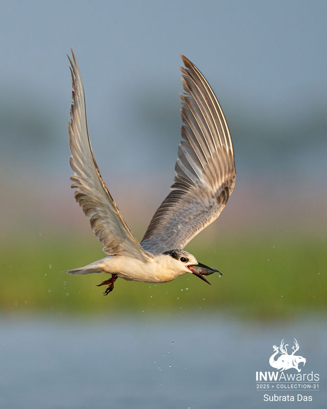This photo was taken in Mangalajodi, Odisha. In this picture shows a whiskered tern in flight, skilfully captured mid-air just above a body of water, with its wings fully outstretched and a small fish held in its beak. The bird’s plumage is a blend of pale grey and white tones, with distinct dark markings on its head and around its eyes, while the background is softly blurred with green and blue hues, emphasising the bird’s dynamic action and graceful movement.