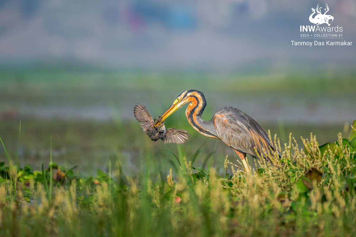 In the month of January 2025, when the atmosphere was covered by fog and mist, I visited Bardhaman District in West Bengal to capture the winter and migratory birds. At dawn, I set out quietly in a small boat and spotted a Purple Heron waiting patiently by the water. Expecting it to hunt a fish or frog, I stayed at a safe distance, ready to capture the action. To my amazement, the heron hunted a Baillon’s Crake, an extremely rare and elusive bird. With perfect instinct and quiet power, it overpowered the crake and finally consumed it. This extraordinary moment revealed the heron’s natural hunting behavior and adaptability in the wild. The sequence from ambush to final capture showcased the raw power and precision of nature. Framed by the misty, serene wetlands, it was a rare natural history encounter that revealed the hidden stories of survival and the unexpected force of life in the wild. In the end, it was the unfortunate Baillon’s Crake that became the heron’s prey.