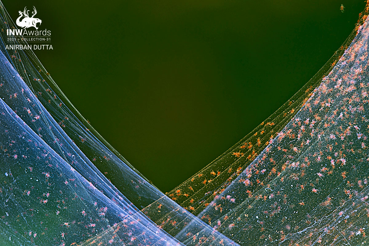 This image look like layers of chiffon sharee on the breast of a beautiful woman and the print on the chiffon sharee is just awesome. Or it may look like layers of curtains on a gorgeous window. This is a unique presentation of Red Spider mites. I found these mites in my backyard. One morning in October last year, I saw them in my garden. These are very tiny in size approx. 1-2 mm. At first I thought these are baby spiders. But my friend told me that these are red spider mites. As macro photographer I have always tried to search and show the unique and unseen small macro world. Spider mites are the plant feeding mites, which are considered as pest, which include various crops, vegetables and flower plants. I have seen many aphides with mites on that leaf. And I have also seen that ants are giving protection to the aphides. Fearing the ants, the spider mites are trying to escape from one leaf to another by creating spider like web net. But the web net is completely different from spiders. They lay eggs on the leaves, when the baby hatches from the eggs, the babies start sucking and eating the leaf cells, causing a lot of damage to the tree. That’s why mites are called enemy of plants, flowers and fruits. This is an in camera multiple exposures shot. I have taken 5 shots in different angles and camera merged them into one. I have used two external flashes one from front and another from back. I have used coloured cello fen paper to musk on flashes. I wish to make a geometrical formation using the layers of webs. The mites on the webs look like print on cloth. This layer of the web makes the image dramatic. Location: Cooch Behar in West Bengal. Device Used: Nikon D500 + Tamron 90mm VC USD G2 + Two Godox external flashes with diffuser and coloured cellofen papers.