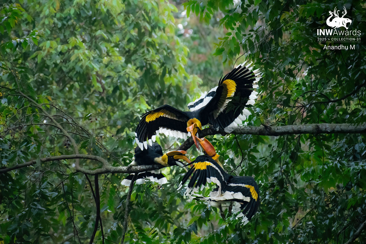 The Great Hornbill is known for its lifelong bond once a pair is formed, they remain together, devoted and protective of each other. Usually seen in pairs, they dislike any intrusions into their private space. On this rare occasion, I witnessed a male hornbill sharing food with his partner, a tender moment of bonding. Suddenly, another male intruded onto the same perch. The peaceful scene instantly turned into a dramatic fight, with the resident male defending his mate and their space. Capturing this intense interaction from Nelliyampathy, Kerala in low light was truly special a fleeting wild moment where love and rivalry clashed in the canopy.