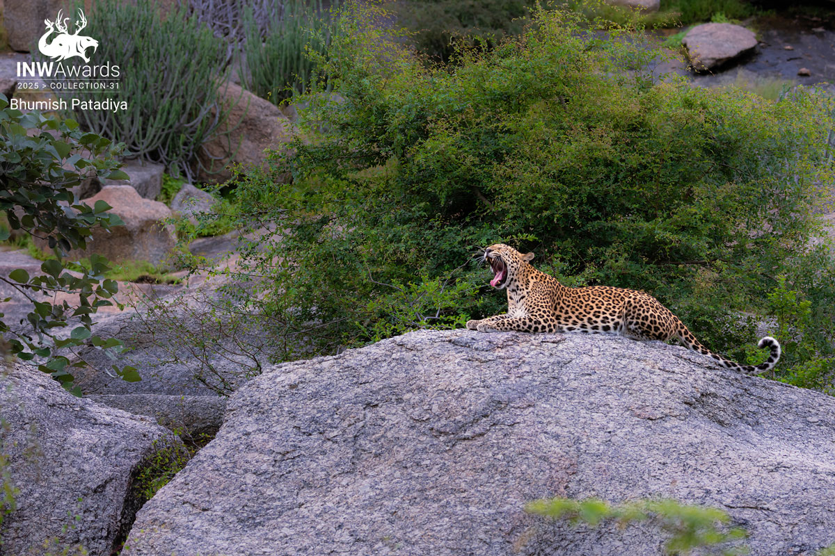 "At the majestic hills of Jawai, I was lucky to witness this unforgettable moment of a leopard resting on the rocks, captured just as it yawned in the calm of nature. The post-monsoon greenery painted the landscape beautifully, adding life to the rugged hills. Jawai never fails to amaze with its raw wilderness and breathtaking encounters like this one." Taken in Sept,2025
