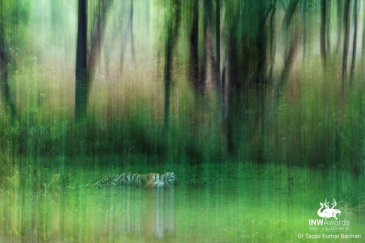 Living in the dream. This photograph of a resting tiger was captured using the ICM (Intentional Camera Movement) technique, where the camera is moved vertically during a slower shutter speed. The motion blur creates a dreamy, painterly effect, while the tiger remains a calm, striking presence within the forest’s abstract beauty. Place: Bandhavgarh, Madhya Pradesh, India