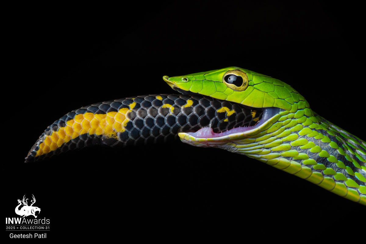 Snake Vs. Snake In a remarkable display of adaptability and survival, a Northern Western Ghats Vine Snake (Ahaetulla borealis) was spotted devouring a Bombay Earth Snake (Uropeltis macrolepis) in Matheran. This extraordinary encounter brought together two species from different worlds - the arboreal vine snake and the burrowing shieldtail. Vine snake employs a remarkable hunting technique, utilizing its binocular vision to scan for prey from an elevated vantage point. Perched atop bushes, it gazes downward, surveying the ground below for potential meals. Photo taken in Mathern, India in June 2025