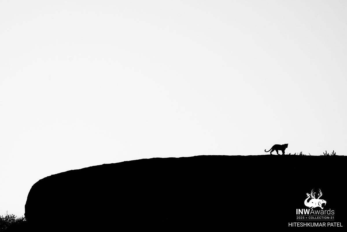 Edge Walker A leopard strides confidently along the rugged granite outcrops of Jawai, silhouetted against a pale sky. The emptiness surrounding this elusive predator highlights the untamed spirit of the landscape where survival and grace meet at the very edge.