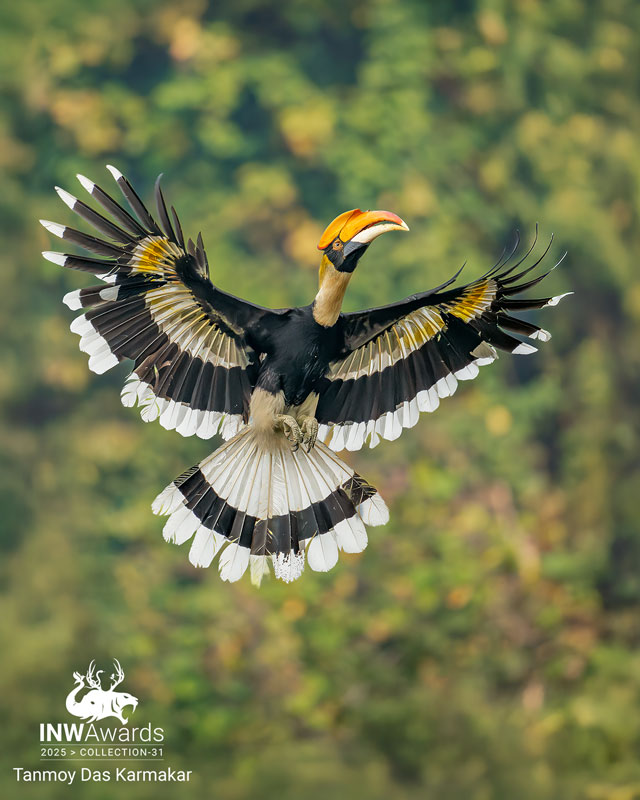 The Great Indian Hornbill is a true giant of the skies, a bird whose presence defines the very spirit of the forest. In Mahananda Wildlife Sanctuary, West Bengal, I was fortunate to witness a rare congregation of over ten hornbills, their resonant calls reverberating across the canopy like echoes of an ancient wilderness. When the flock suddenly burst into flight, the forest came alive with aerial duels, playful pursuits, and courtship displays marking the onset of the breeding season. Amid this spectacle, one hornbill unfurled its colossal wings in mid-air, its flight both commanding and elegant. Through my lens, I sought to preserve not just a fleeting moment of beauty, but the enduring voice of the rainforest itself.