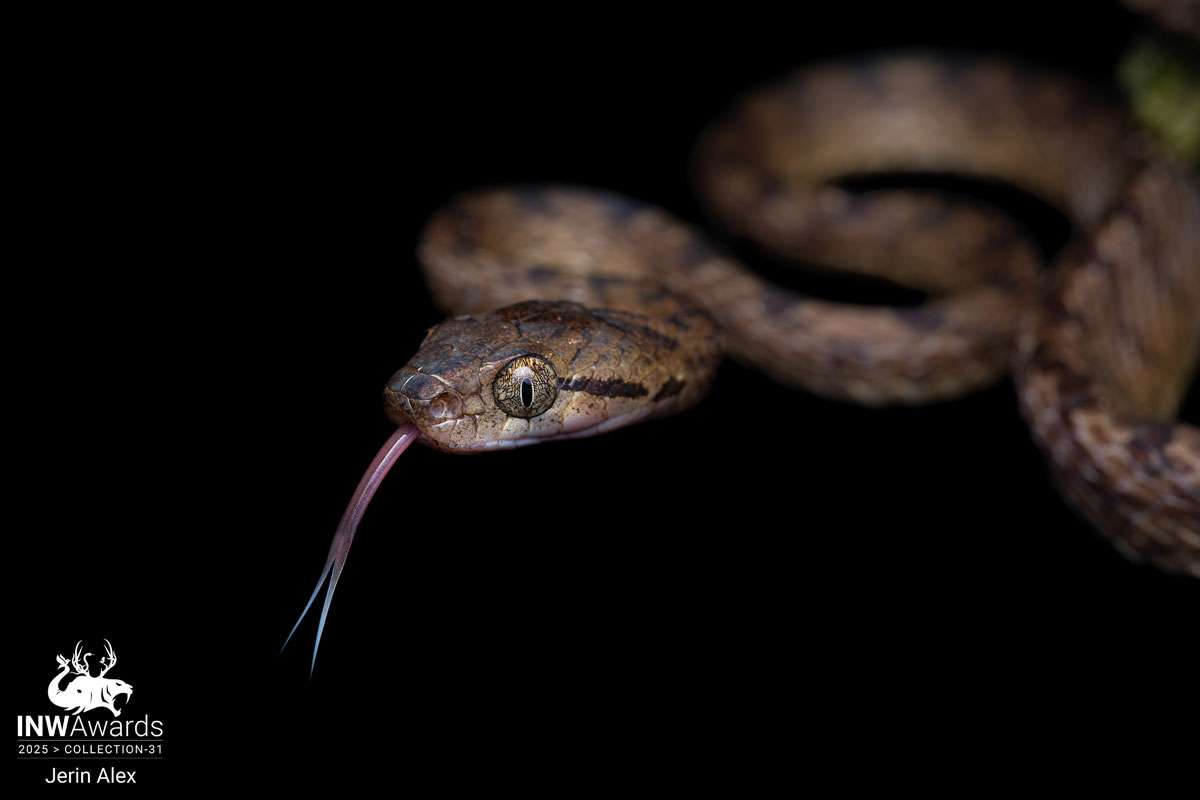 The elusive Collared Cat Snake, a rare jewel of the Western Ghats, captured under the veil of Agumbe’s rainforest darkness.