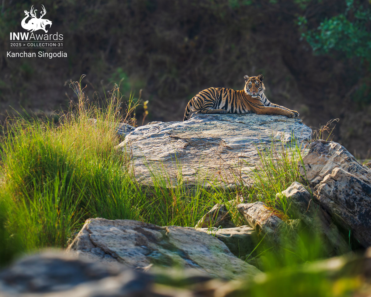 This picture has been taken from a boat in Panna Tiger Reserve. There was a confirmed news about P141 and her cubs on the river bank feasting on the sambhar kill. We had gone looking for them on the previous day during evening but they were hiding because of the repeated movement of boat. In my morning safari I went straight to the boat as I wanted them in the morning light. Cubs were playing around the rocks when I reached the spot. And while playing one of them decided to take a break on this rock making it a dream frame for me with the morning warm light falling on the cub.