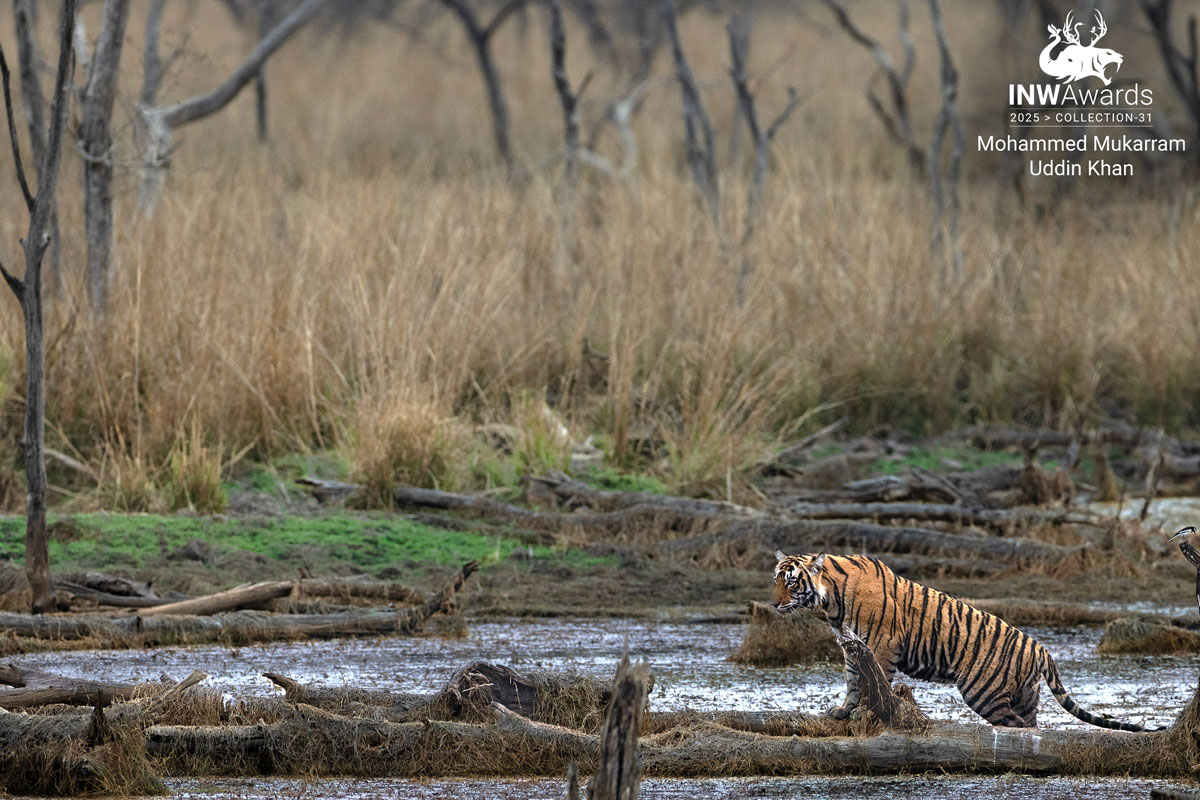 Captured in the heart of Ranthambore National Park, home to some of India’s most majestic tigers. The young sub-adult tiger in the frame is one of Tigress Riddhi’s cubs, beginning to explore life while still carrying curiosity of youth. The swampy stretch seen here is a classic summer retreat for tigers — a mix of cooling water, fallen logs, and tall grasses that provide shade and camouflage. Such habitats are vital for their survival, offering both relief from the scorching heat and a safe space to rest while remaining hidden. The image reflects the perfect balance of strength and serenity, a tiger poised within its natural landscape. Taken with Canon R1 400MM
