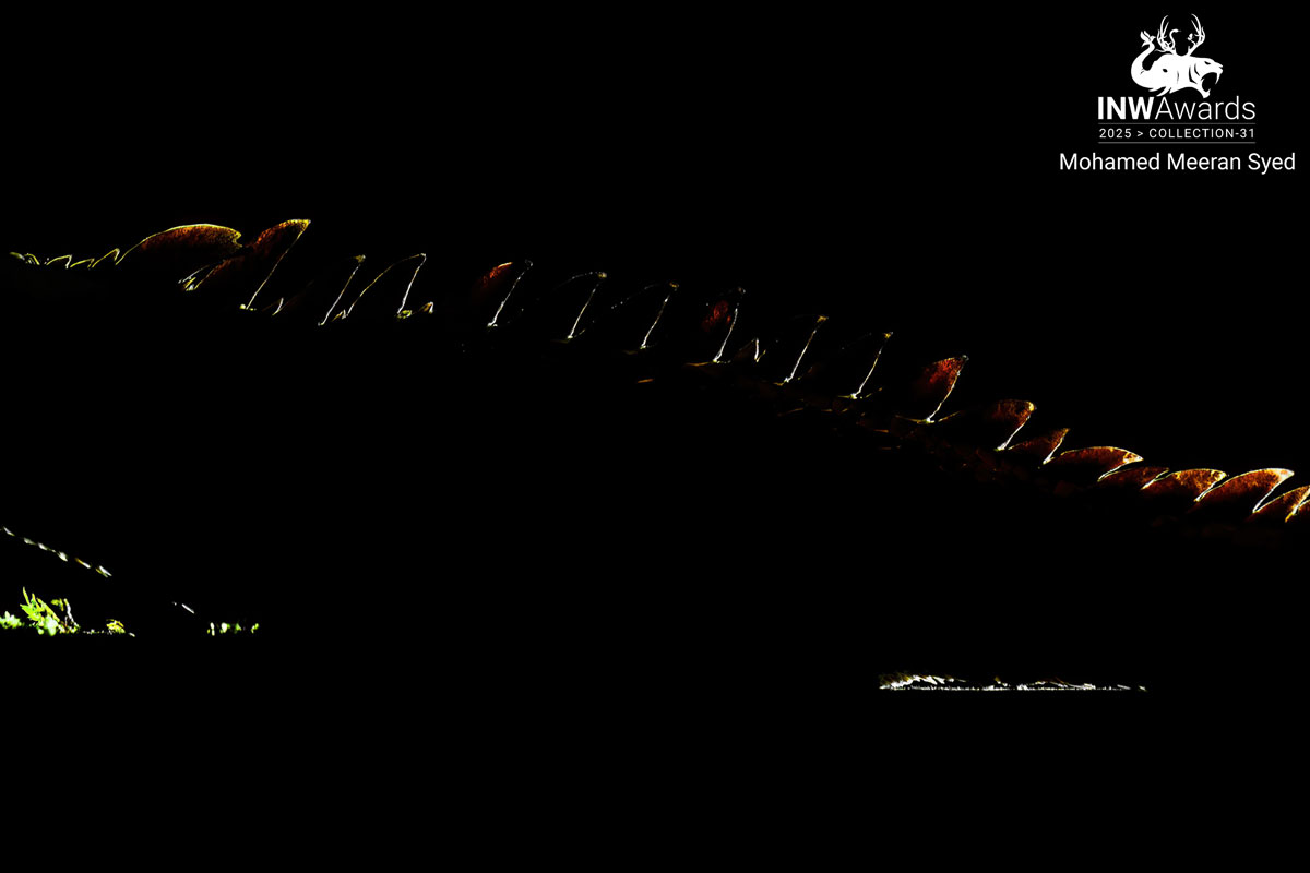 this backlit portrait of the Anamalai Spiny Lizard (Salea anamallayana) isolates its most striking feature—its jagged dorsal spines, silhouetted like ancient armor. Endemic to the southern Western Ghats, this elusive agamid thrives in montane shola forests and tea plantations at altitudes of 1700–2300m. Its spiny scales not only aid in camouflage but also deter predators. As an insectivore, it plays a vital ecological role by regulating arthropod populations, maintaining balance in fragile high-altitude ecosystems. This image, captured in Munnar rain forests with deliberate torch placement to accentuate the spines alone, pays homage to the lizard’s evolutionary artistry and its quiet guardianship of the forest floor.