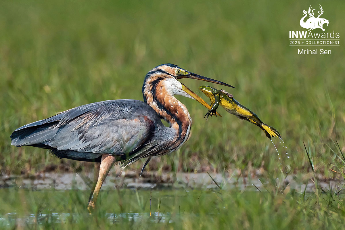 Enter the dragon - In the wetlands of Mangalajodi, Odisha, a Purple Heron waited silently among the reeds. With a sudden strike, it caught a large Indian Bull Frog, which leapt in vain to escape. What followed was a patient display of skill—the bird tossing and turning its prey again and again, trying to position it just right. For over ten minutes the struggle continued, water droplets sparkling in the air, until finally the frog slid down the Heron’s throat. The marsh returned to silence, holding within it the timeless rhythm of survival.