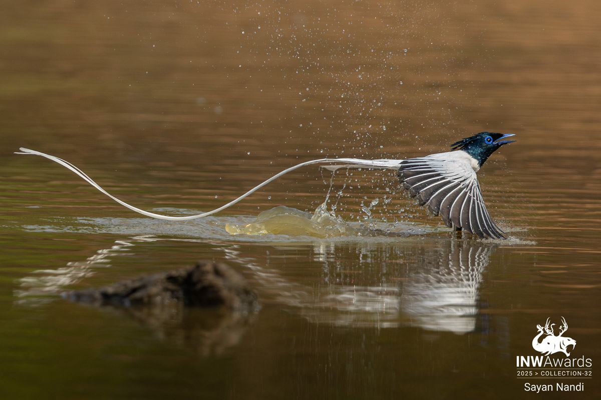 I photographed this Indian paradise flycatcher mid-bath while splashing vigorously in shallow water in Binka, Odisha, in April 2025. After waiting patiently through the summer morning for this exact moment, it finally happened – the flycatcher's graceful bathing ritual unfolding in perfect light, a rewarding end to hours of anticipation.