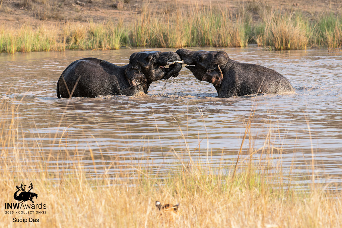 You are under CCTV surveillance: The elephants are often seen in water, try to cool their body from excessive summer heat. The elephants were enjoying at the waterbody by grassland. The elephants were not aware about the presence of tiger who was hiding itself in the thicket of grassland besides waterbody and was watching the activities of elephants hiding inside tall grasses. The photo was taken on April 2023 at Bandhavgarh National Park, MP, India.