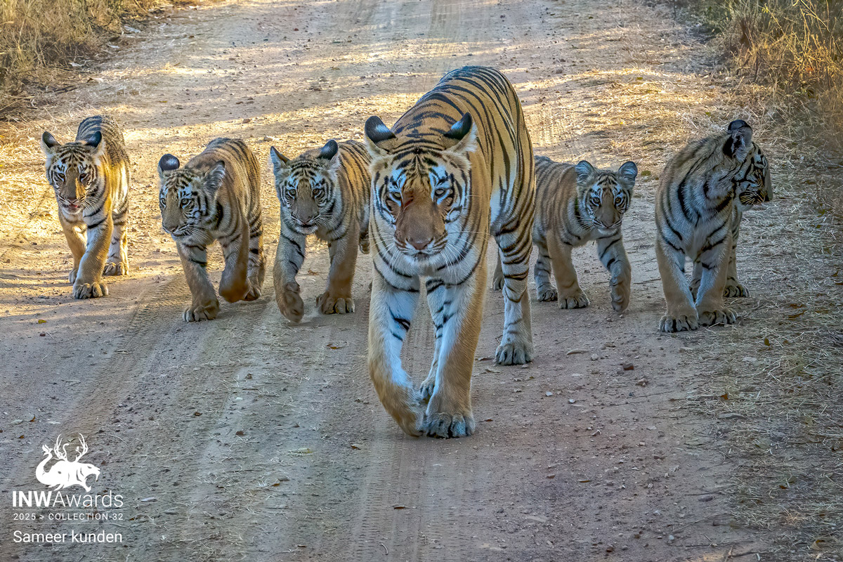 Tigress on the move with her five playful cubs… a once-in-a-lifetime sighting and a frame every photographer hopes for. Capturing all six together in stride was a moment when patience, luck, and the wild aligned.