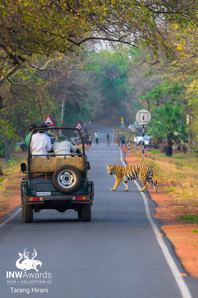 Humans & Wild! During one of my safaris in Tadoba Tiger Reserve, I witnessed a moment that perfectly sums up the fragile balance between humans and the wild. A young sub-adult tigress waited patiently by the edge of a road — a civil road cutting right through the jungle — wanting to cross to the other side where her mother and sister were. After a long wait, she finally gathered courage and stepped onto the road. But as she saw people standing, vehicles moving, and even a bike approaching, she froze. Overwhelmed by our presence, she turned back into the forest. I managed to capture this moment — a glimpse of how close the human–wildlife conflict truly is. Roads through forests may connect places for us, but they fragment homes for them. Shot in Oct 2025 by Nikon Z8 180x600 at Tadoba Tiger reserve