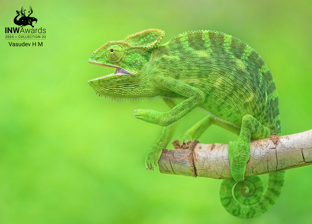 In the quiet wilderness near Chamarajnagar, this master of disguise revealed itself for just a moment—blending so seamlessly into the green world around it that it felt like the leaves had come alive. The chameleon clung to its perch with effortless balance, its textured skin shifting shades to match the light. With one eye scanning its surroundings and the other fixed ahead, it embodied the perfect balance of patience and precision. As it opened its mouth slightly, it seemed to whisper the secrets of survival—adapt, observe, and blend in. A rare glimpse of nature’s most gifted camouflage artist.