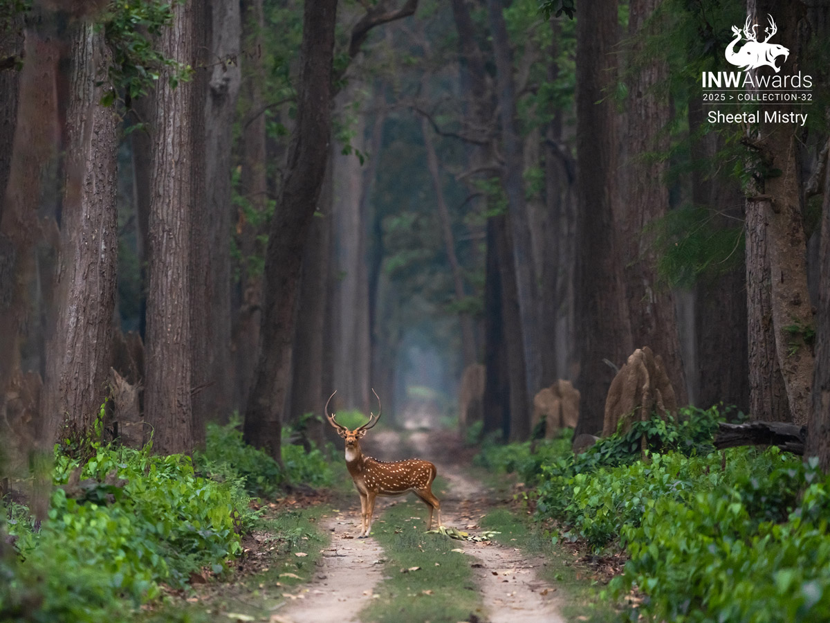 Morning arrives softly in Dudhwa, as green leaves let in gentle light above. A deer stands quietly in the trees, its eyes bright and alert to every sound, calm and still.